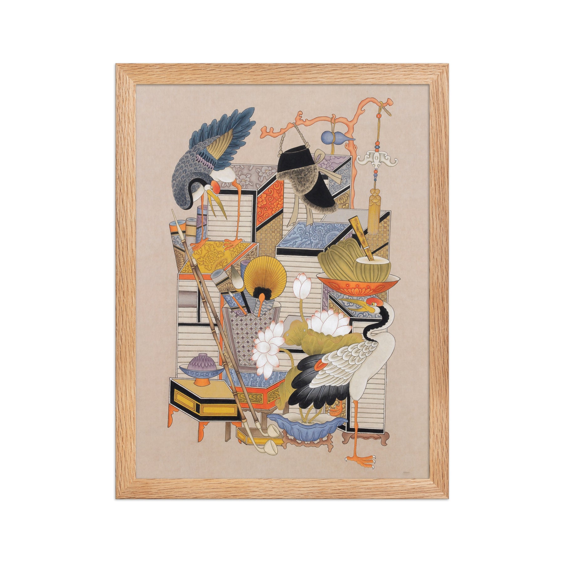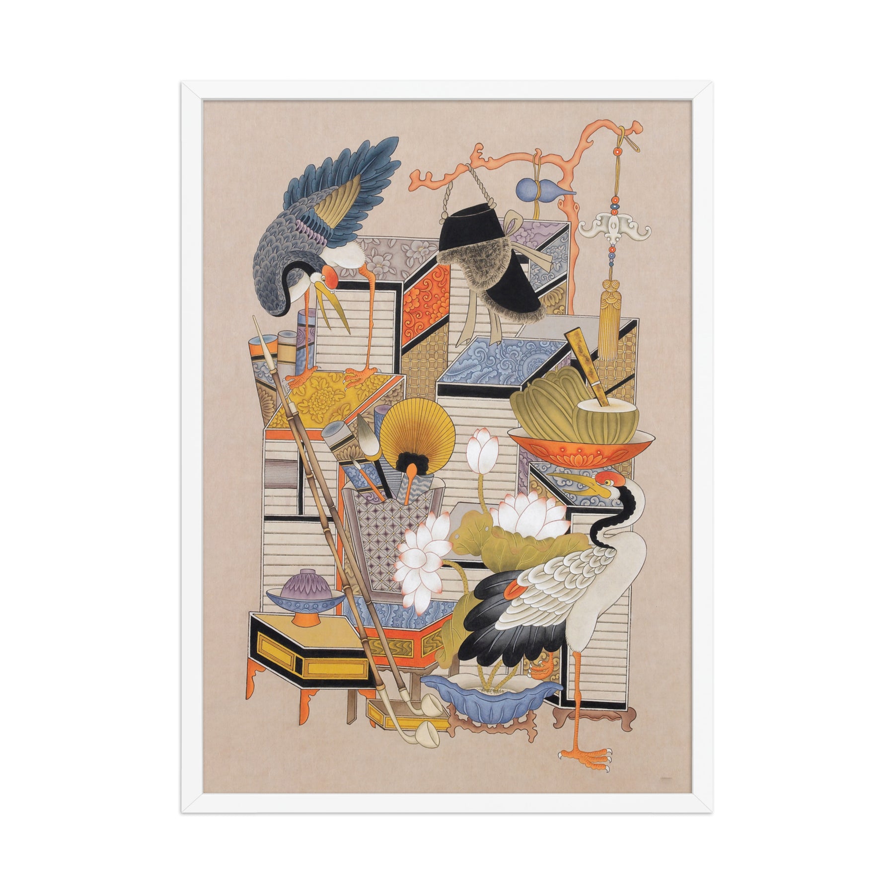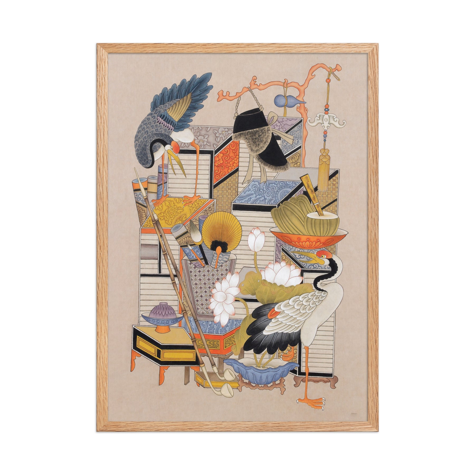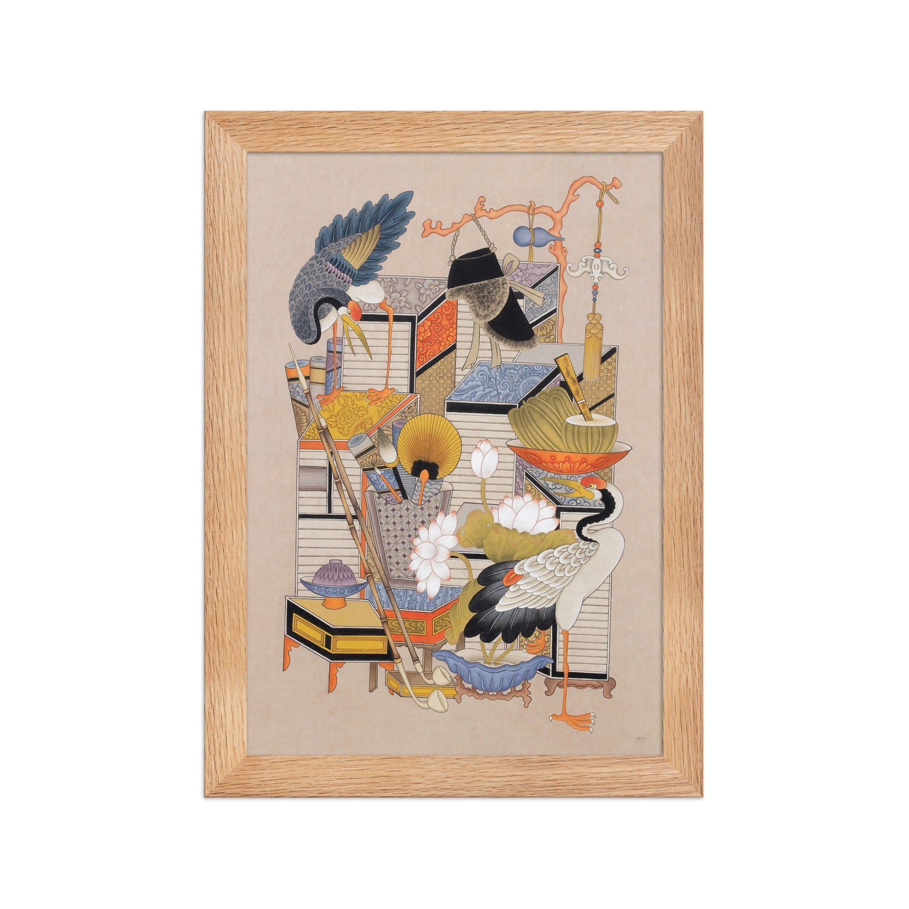 This Chaekgeori with crane shows longing for knowledge as a calm, lifelong process.