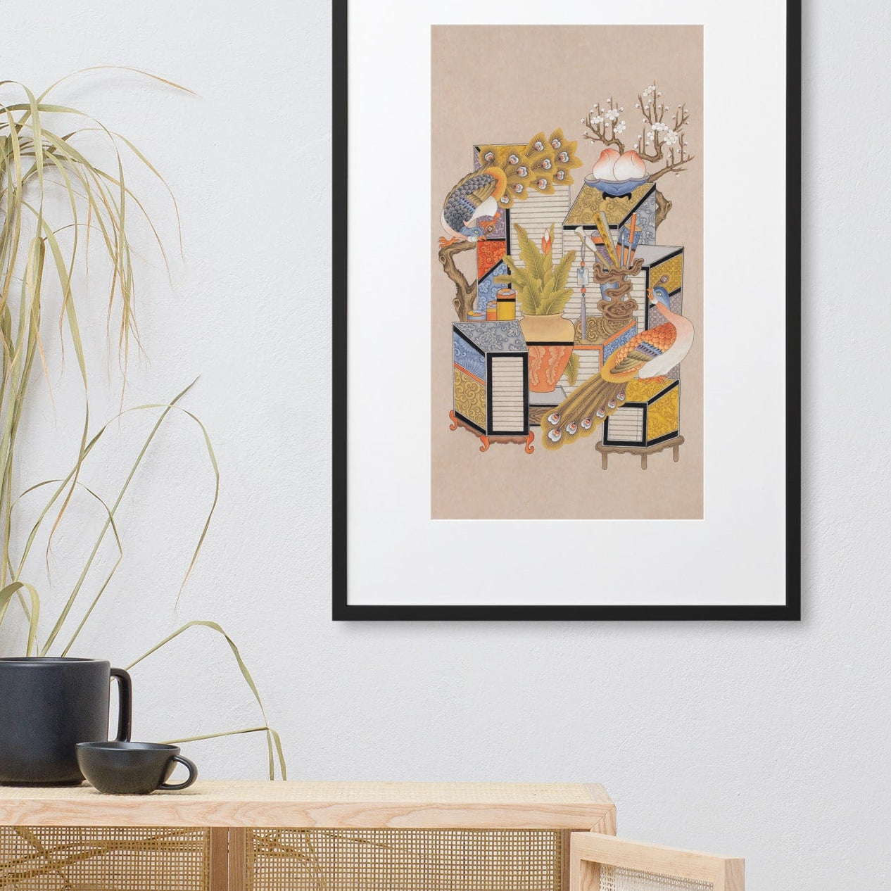 In diesem Werk bewegt sich der Pfau zwischen Büchern, Schreibutensilien und Pflanzen.